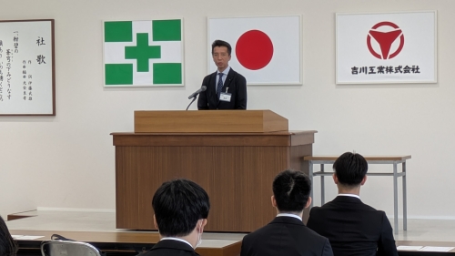吉川工業ファインテックでは2025年10月1日(水)グループ会社である吉川工業と合同のもと、 内定式を行いました。 式では2026年度に当社への入社が内定している4名に内定証書が授与され、歓迎のあいさつを 行った後、グループワークなどを実施しました。 内定者歓迎の挨拶を行う栗屋執行役員 式の後は場所を移動しての懇親会を開催、内定者同士の交流をさらに深めました。
